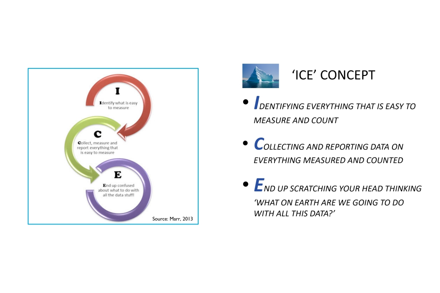 Incident reports are another very common Safety Performance Indicator (SPI) generating copious amounts of work for organisations – often snowballing into a well-intentioned but misguided cottage industry of data collection, over-analysis and graphical interpretation categorized by complex taxonomies and ‘ages of reporting’. Unfortunately it is human nature to collect data which is easy to count and measure then place too much faith in what that data is actually telling you without retaining the all-important context; this phenomenon is described by Marr (2013) as ‘ICE’: